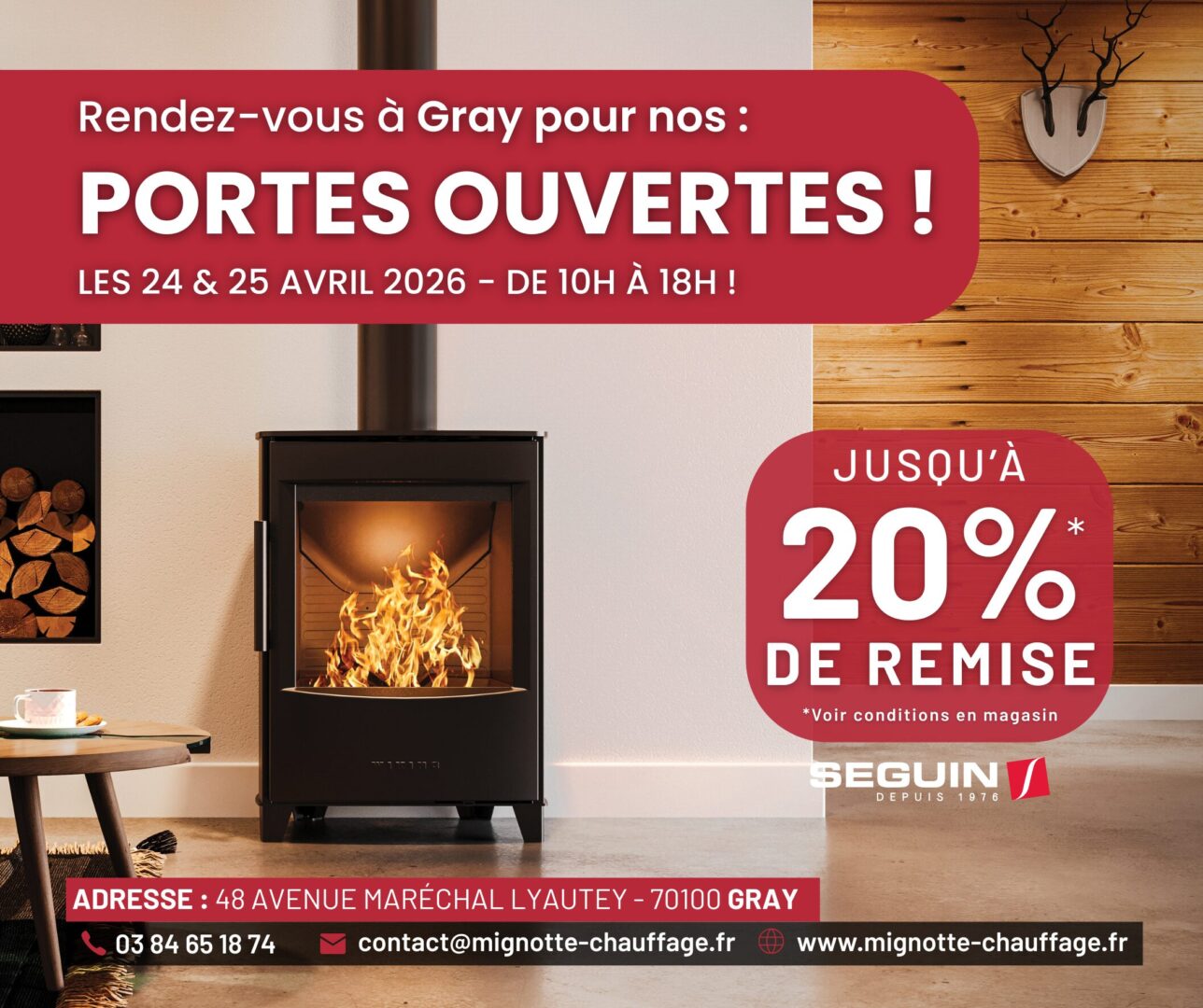 Les 24 et 25 avril 2026, Cheminées & Poêles Mignotte / Mignotte Chauffage vous accueille dans son showroom de Gray à l’occasion de ses Portes Ouvertes.